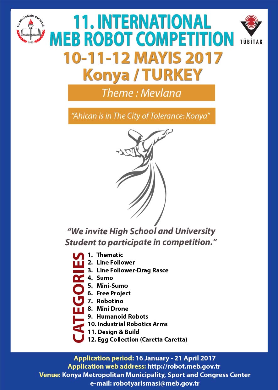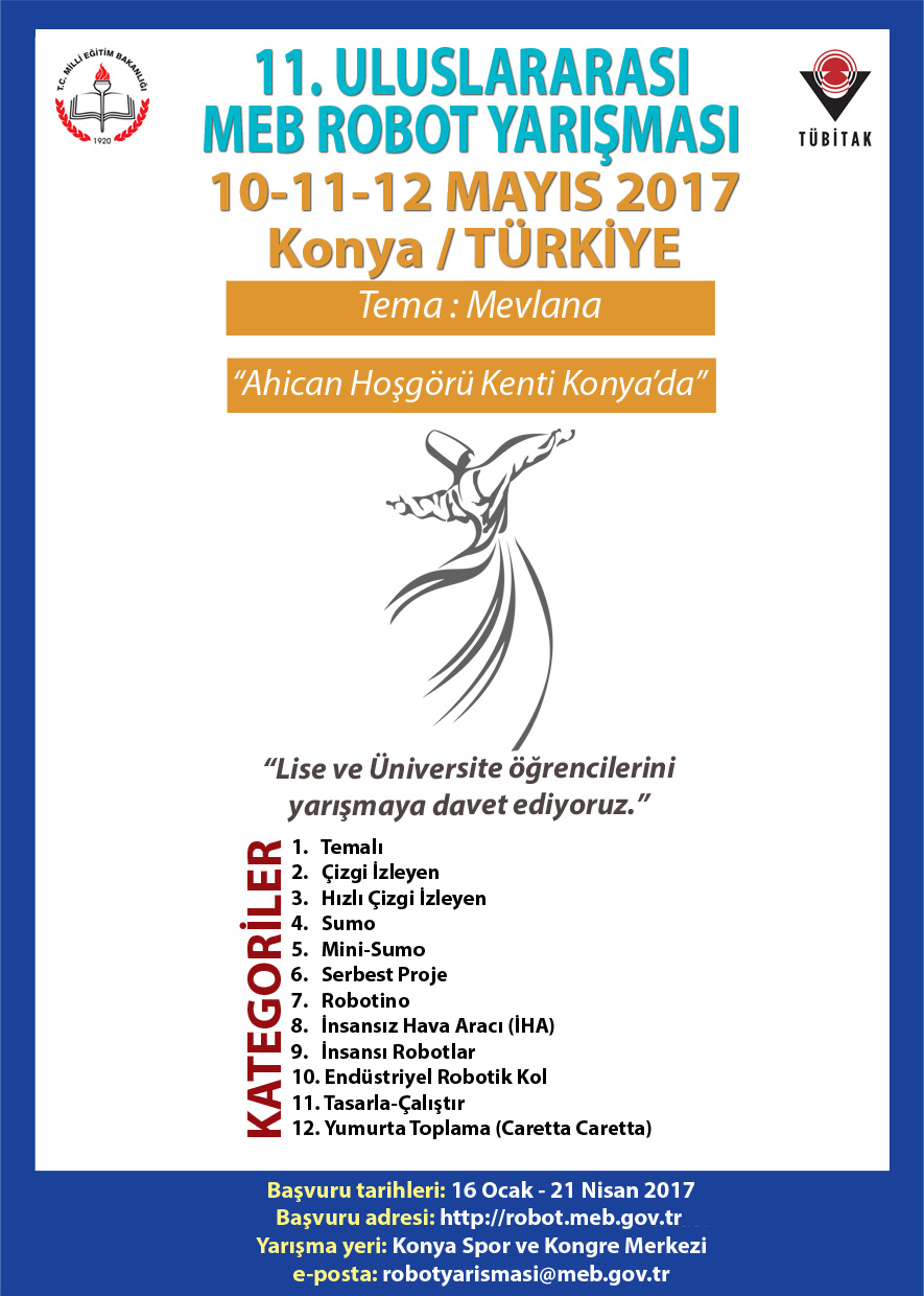 Ülkemizde mesleki ve teknik eğitimin niteliğinin artırılması, toplumda bu alanda farkındalık oluşturulması, lise ve üniversite öğrencilerinin eğitimleri sürecinde edindikleri bilgiyi beceriye dönüştürebilen, ürün geliştirebilen, bilimsel düşünebilen, girişimci ve rekabetçi bireyler olarak yetiştirilmesi, endüstriyel ve teknolojik gelişmelerin tanıtılması, sergilenmesi ve deneyimlerinin paylaşılması amacıyla 11. Uluslararası MEB Robot Yarışması 10-12 Mayıs 2017 tarihleri arasında Konya Büyükşehir Belediyesi Spor ve Kongre Merkezinde düzenlenecektir.