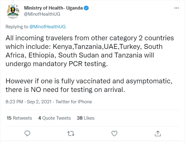 Türkiye'den Uganda'ya seyahat eden yolculardan iki doz aşı olmuş olmaları halinde ülkeye girişte yeniden PCR testi istenmeyecektir.
